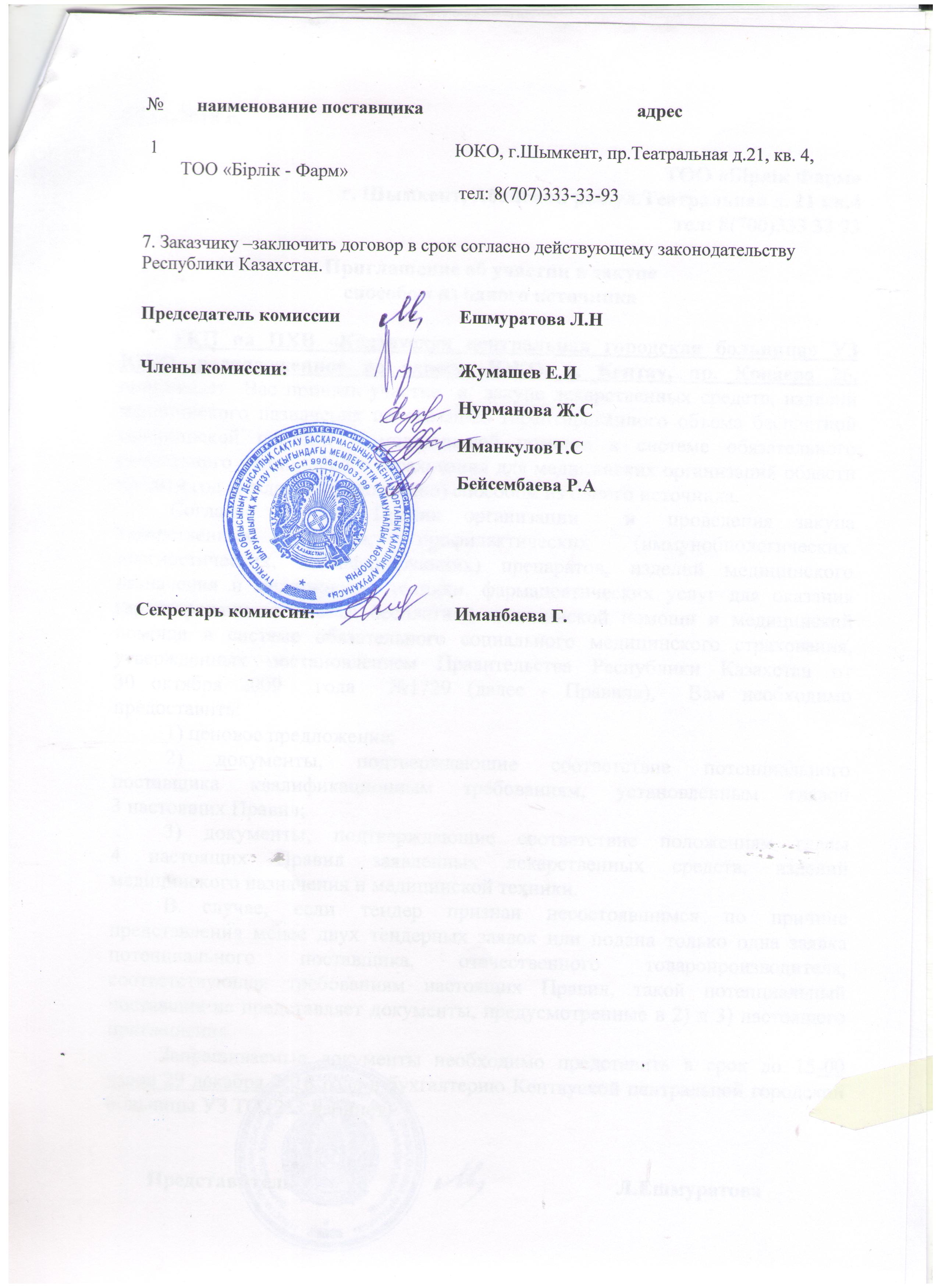 - Заказчику –заключить договор в срок согласно действующему законодательству Республики Казахстан.