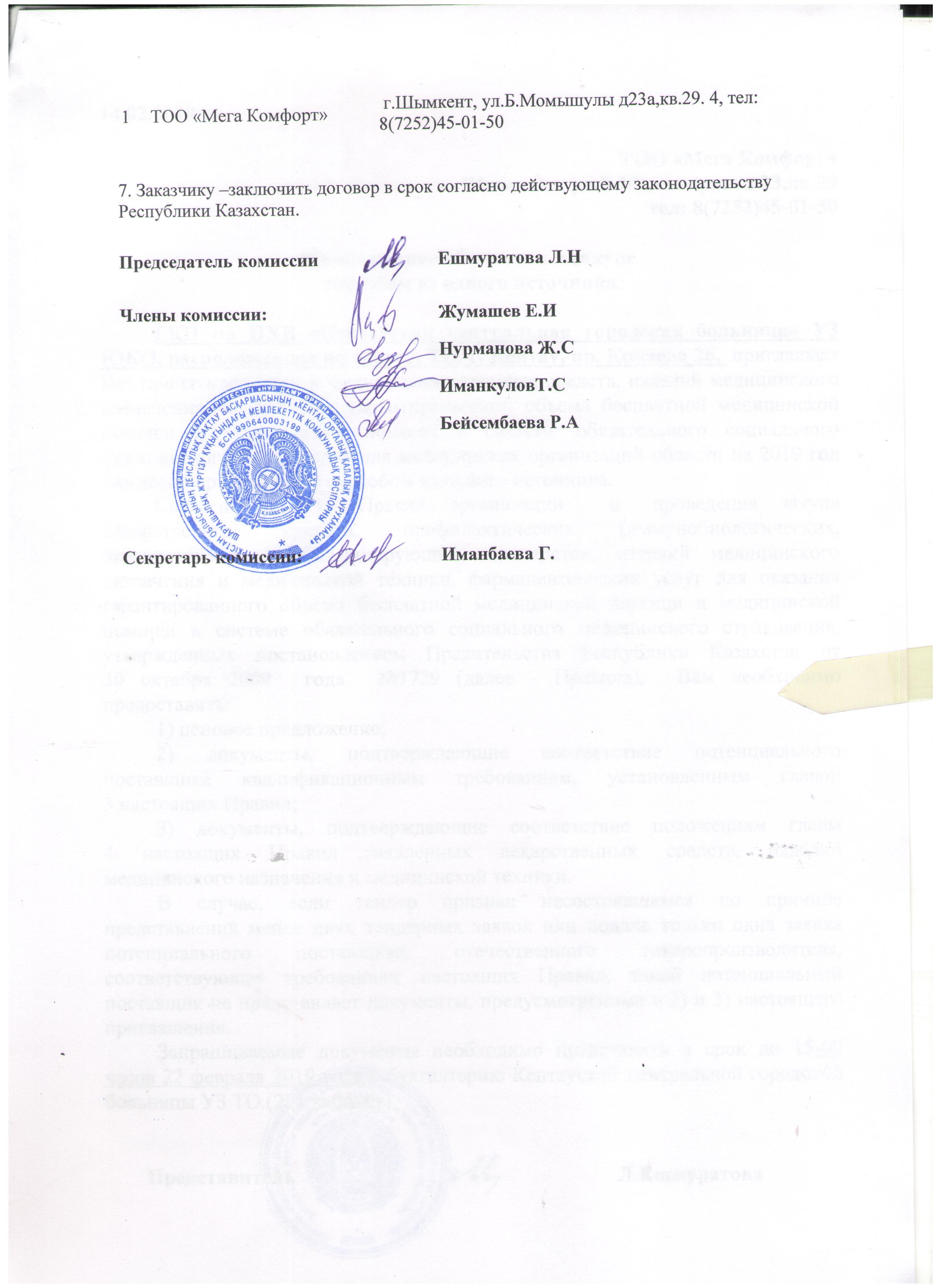 - Организатор государственных закупок – ГКП на ПХВ «Кентауская центральная городская больница» УЗ ТО по результатам закупа изделий медицинского назначения по оказанию гарантированного объема бесплатной медицинской помощи и медицинской помощи в системе обязательного социального медицинского страхования для медицинских организаций области на 2019 год способом из одного источника