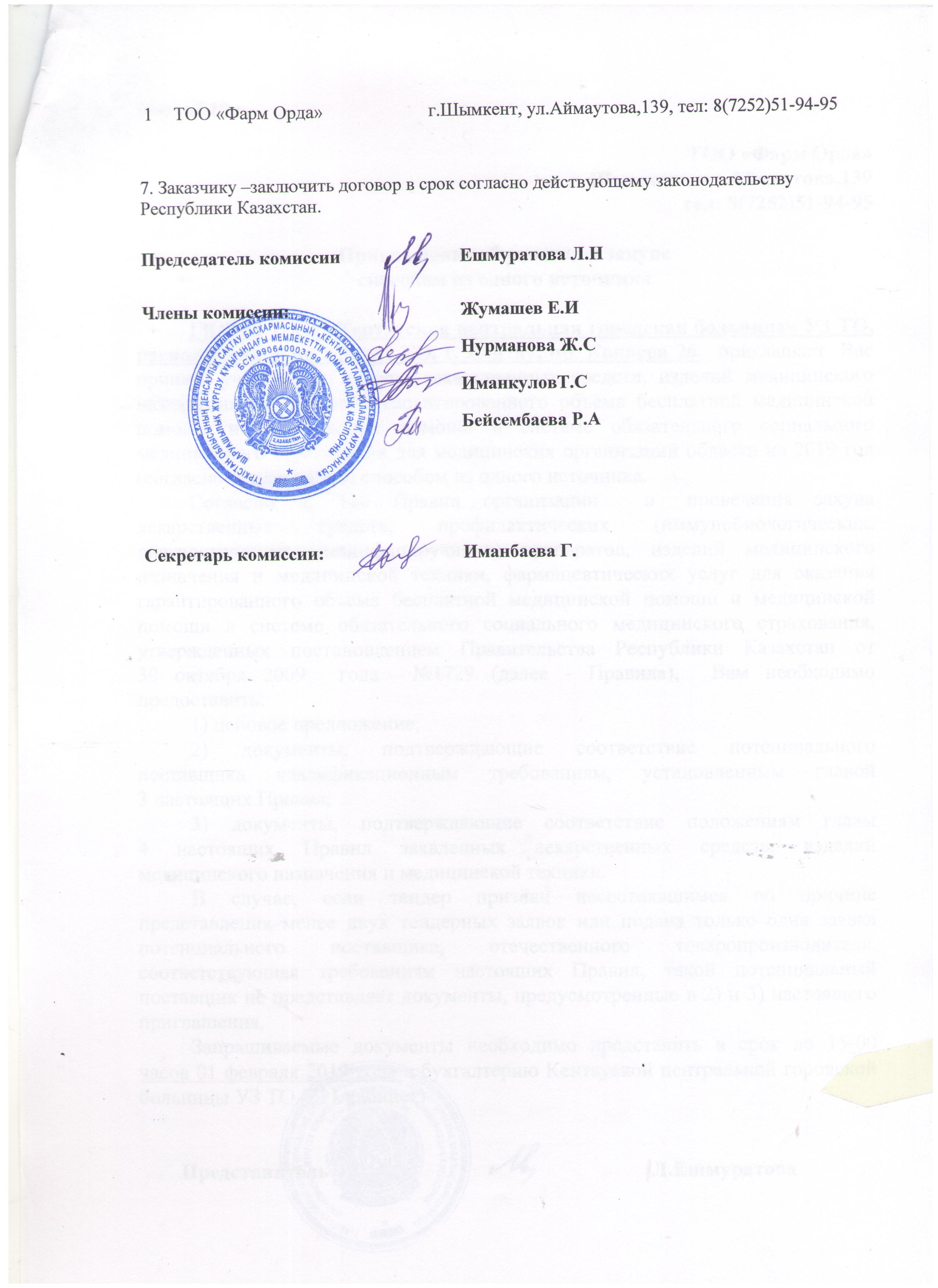 - Заказчику –заключить договор в срок согласно действующему законодательству Республики Казахстан.