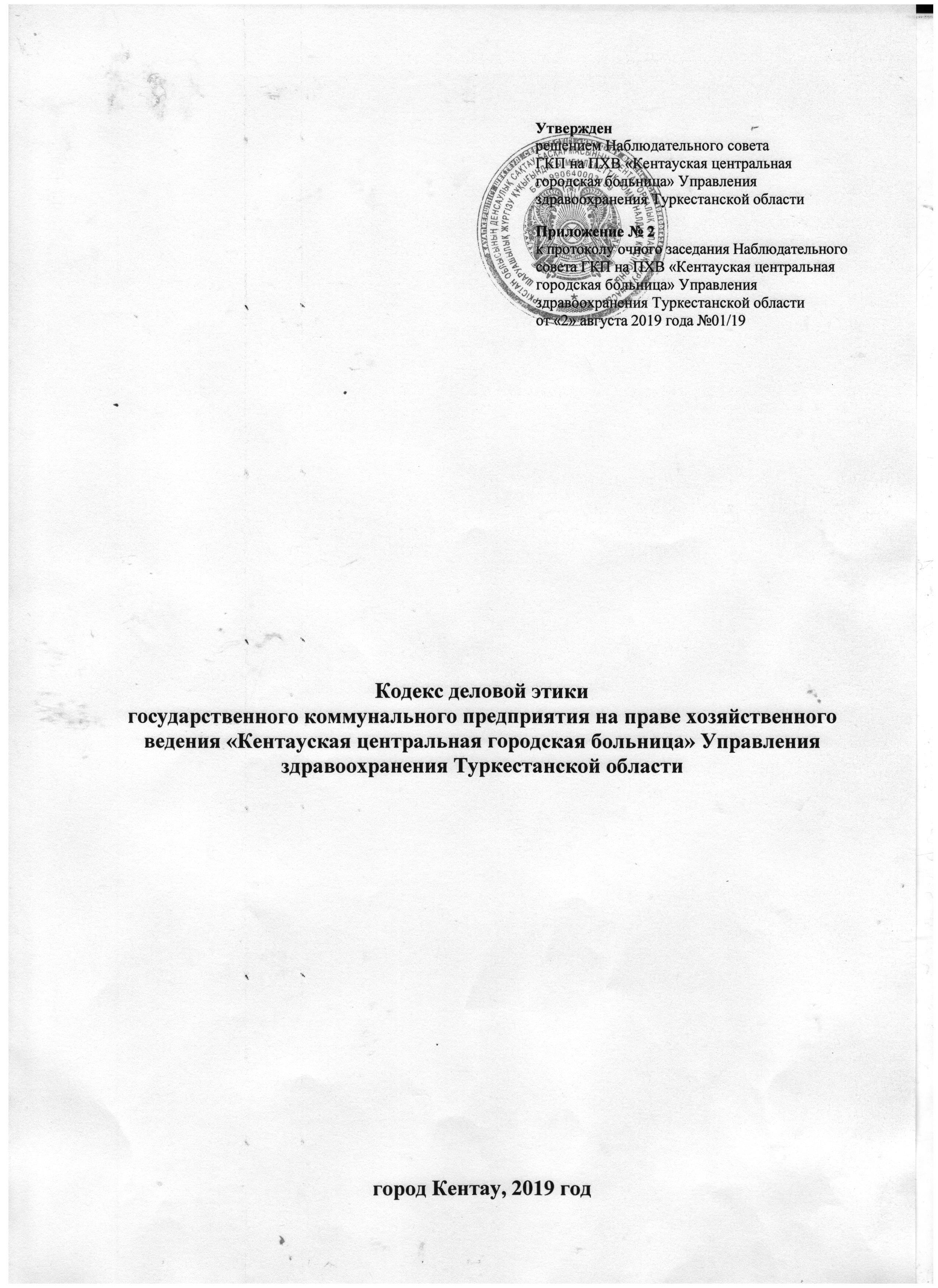- Кодекс деловой этики (далее – Кодекс) государственного коммунального предприятия на праве хозяйственного ведения «Кентауская центральная городская больница» Управления здравоохранения Туркестанской области (далее – Предприятие) разработан в соответствии с законодательством Республики Казахстан, Уставом и иными внутренними документами Предприятия и представляет собой свод правил и принципов.