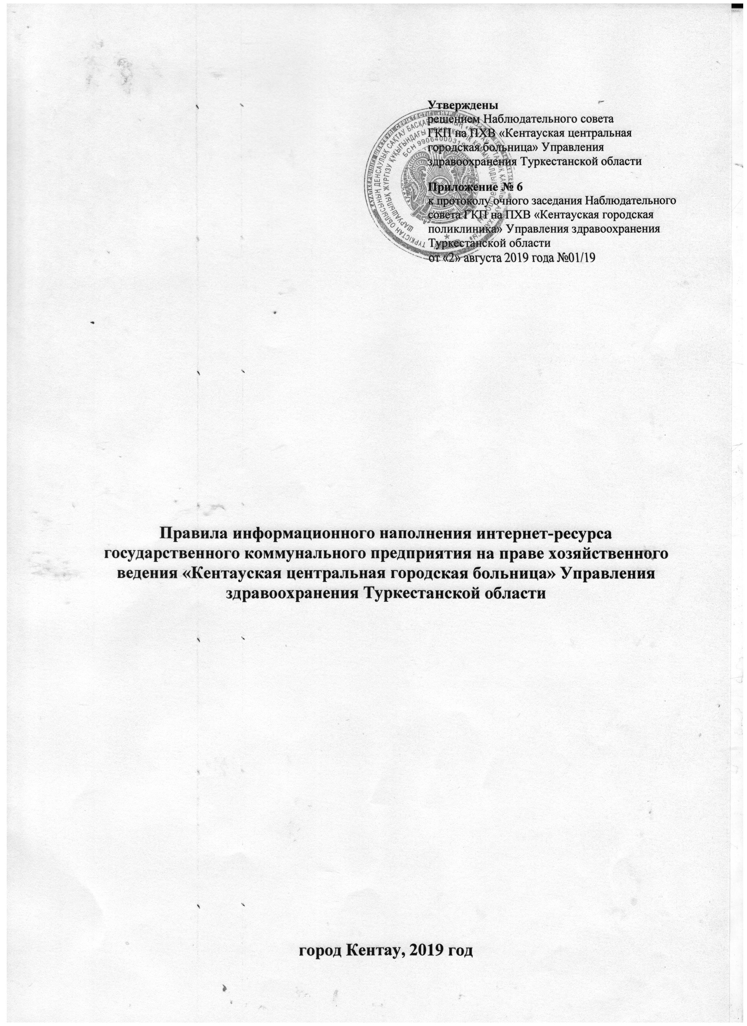 - Правила информационного наполнения интернет-ресурса (далее – Правила) государственного коммунального предприятия на праве хозяйственного ведения «Кентауская центральная городская больница» Управления здравоохранения Туркестанской области (далее – Предприятие) разработаны в соответствии с действующим законодательством Республики Казахстан и определяют порядок размещения на официальном сайте и обновления информации о Предприятии, за исключением сведений, составляющих коммерческую, служебную и иную охраняемую законом тайну.