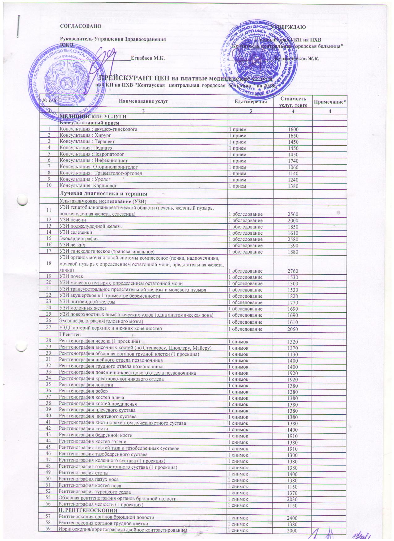 | № п/п | Наименование услуг | Ед.измерения | Стоимость услуг, тенге | Примечание* |